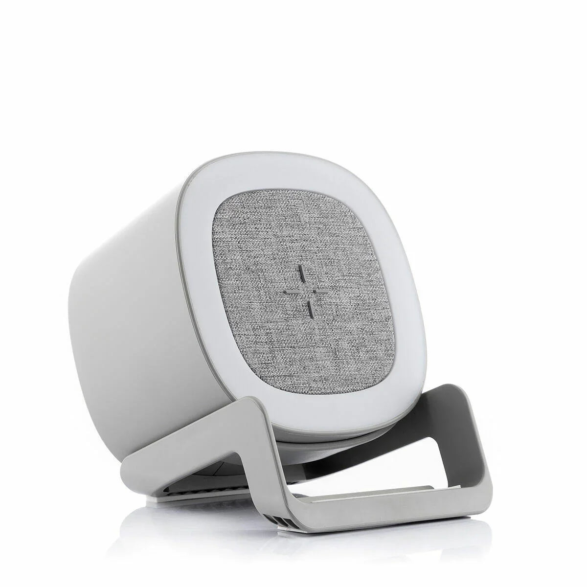 Un original cargador inalámbrico con LED y altavoz que dispone de botón táctil para activar la luz LED y 2 zonas de soporte para colocar el móvil en posición horizontal o vertical.